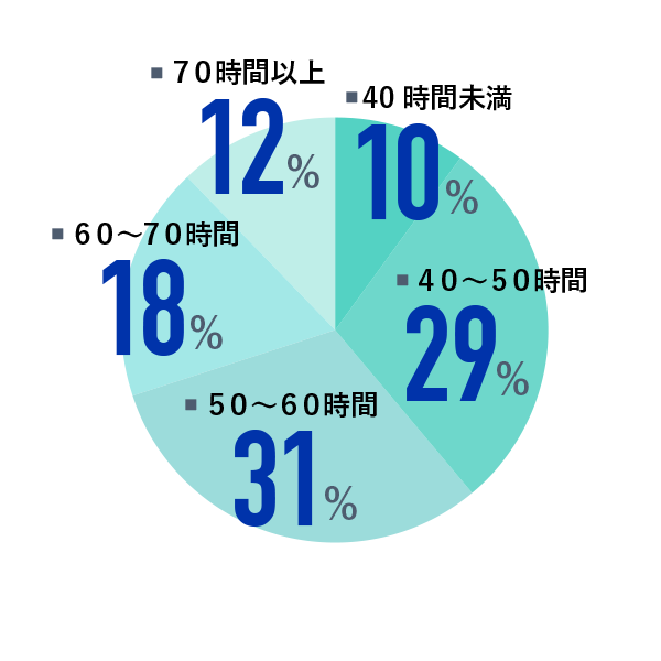 一般的な規定労働時間にあてはめて週休二日で1日あたり8時間で計算すると、週の労働時間は40時間となりますがアンケートで最も多かったのは、週50〜60時間で全体の31%、次いで40~50時間の29%、60〜70時間でも18%と、やはり美容師の労働時間は長めという結果になっています。美容室の営業時間にありがちなのが10時~20時ですので、実際どうかは別として休憩時間60分を除くと毎日1時間残業し9時間労働となりそうです。週5日9時間で週45時間、週6日9時間で54時間となりこのゾーンにあてはまる人が最も多いのではないでしょうか。