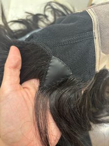 編み込みではなくすっぽり被るタイプのウィッグです。テープを貼りやすいように、つるつるの黒いベースを手縫いで縫い付けます。