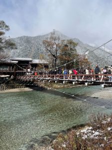 ココカモブログをご覧の皆さんこんにちは!レディス事業部、渋谷サロン勤務の郷原です!大自然に癒されたいと思い、地元(長野県出身です)への帰省も兼ねてですが、上高地に行ってきました!上高地は日本を代表する山岳リゾートで、穂高連峰・焼岳・霞沢岳など、北アルプスの名峰に囲まれた大自然の中にあります。紅葉を見に行ったんですが、ものすごく寒い日で、まさかの雪景色でした!上高地のシンボル的存在河童橋です!