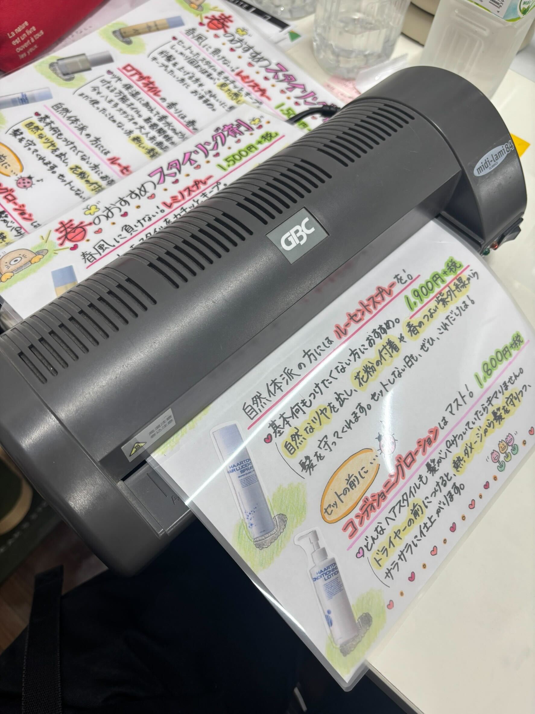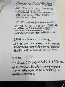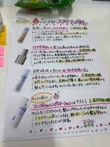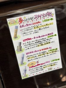 今回のPOPは「春のおすすめスタイリング剤」にしましたが、桜のシーズンが終わってもしばらく貼っておけるように、あえて桜を描かなかったのがポイントです(^O^)!